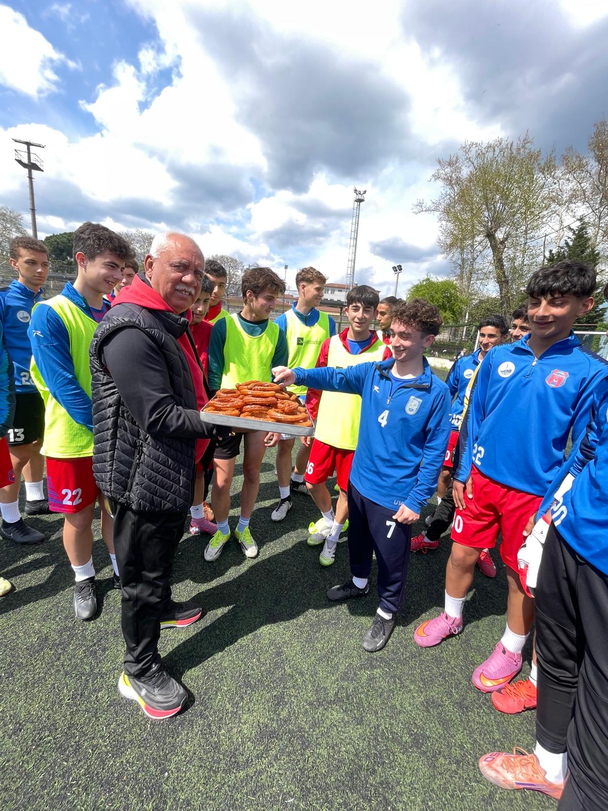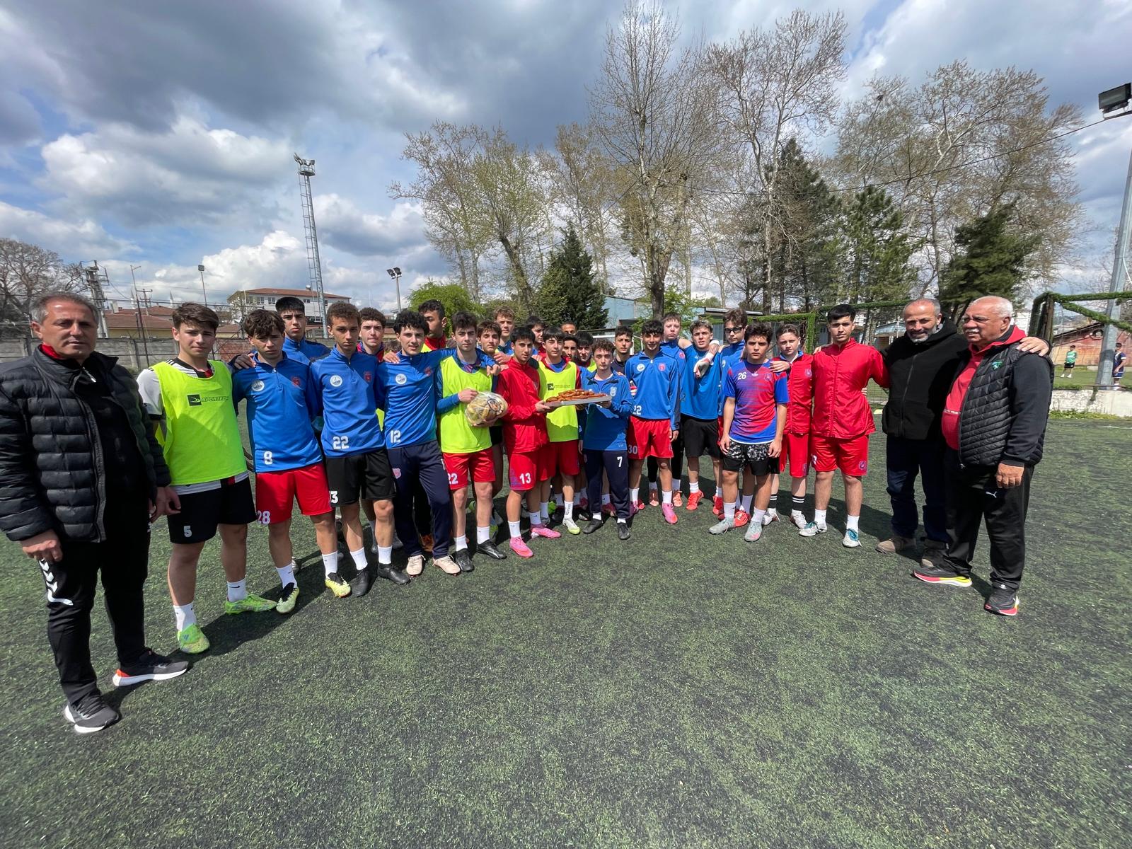 Gelişim Liginde Playoff ilk maçında İstabul Ümraniye Park Stadında Feriköyle karşılacak olan Derince Birlik U-16 takımının son antremanını ziyaret eden Derince Birlikspor Kulüp Başkanı Başkan Şaban Eraslan ve kaleci antrenörü Süleyman Eker oyunculara ve teknik heyete muz ve tatlı ikramında bulundular.