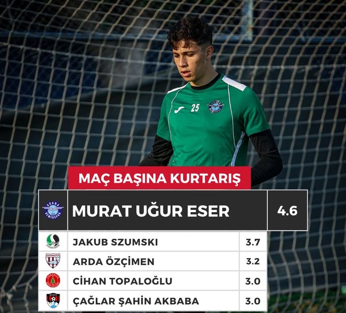 TFF 1.Ligte 20 takım arasında maç başına en çok kurtarış yapan kaleci olarak ilk sırada yer alıyor.