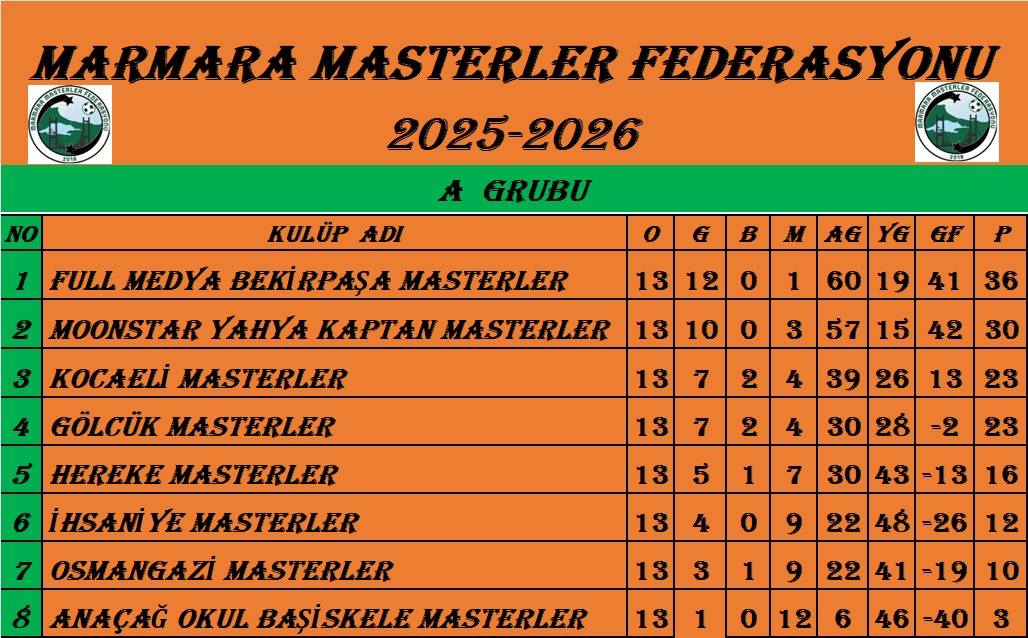 A ve B Grubunda toplam 15 takımın katılımıyla düzenlenen ve 40 yaş üstü sporcuların yer aldığı Marmara Masterler Liginde normal lig heyecanı haftasonu oynanacak maçlarla sona erecek.