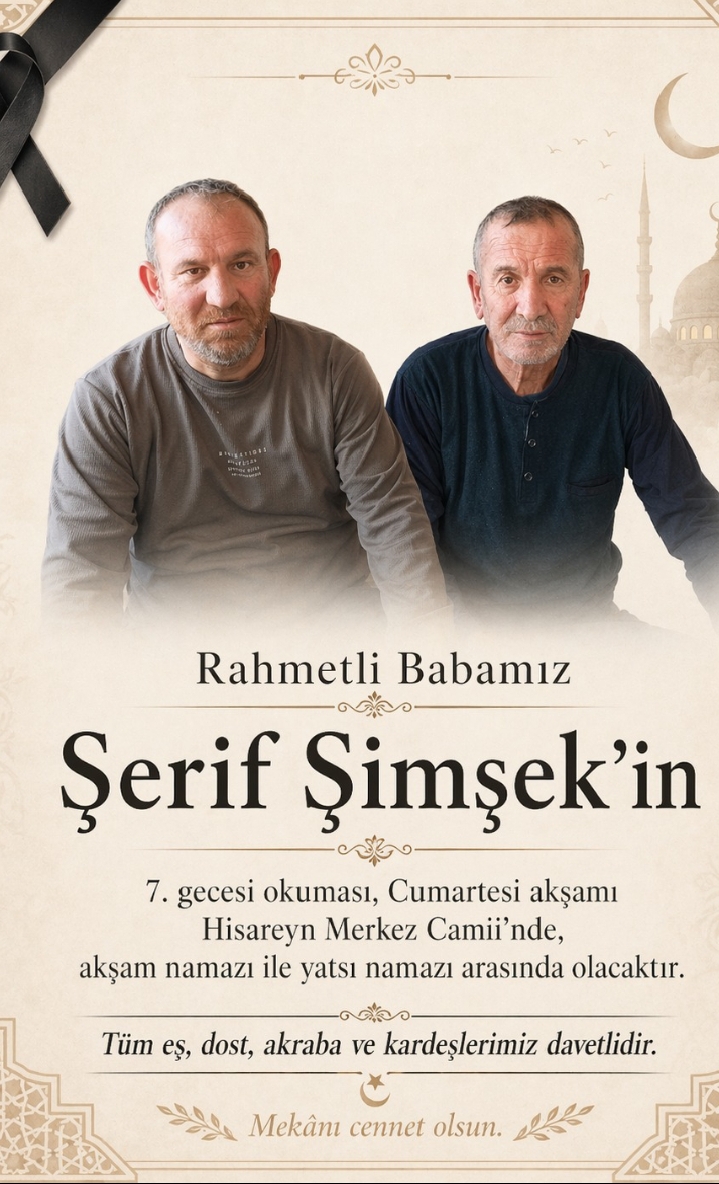 Şimşek ailesi 25 Nisan Cumartesi akşam namazı ile yatsı namazı arasında Hisareyn merkez camiinde düzenlenecek okuma programına tüm sevenlerini davet ediyor.
